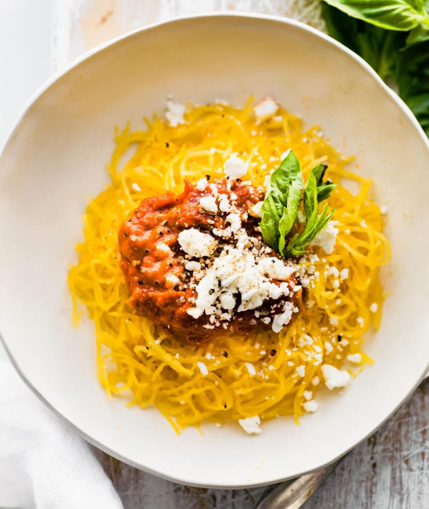 Braised short rib ragu served with spaghetti squash pasta, pecorino Romano, and Italian basil,