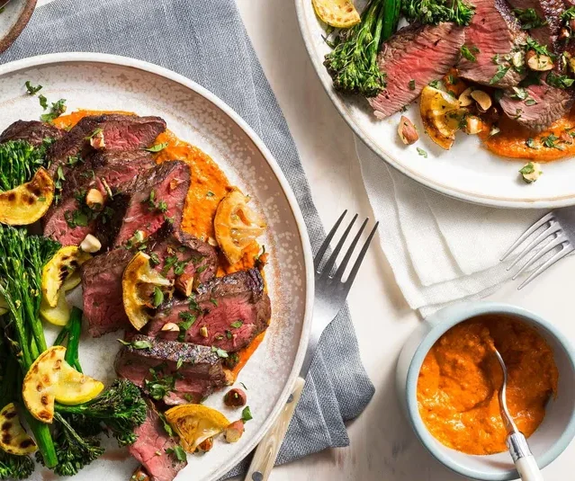 Grilled Spanish USDA Prime strip steak topped with smoked almond romesco over crispy saffron cauliflower rice, and seasonal vegetables