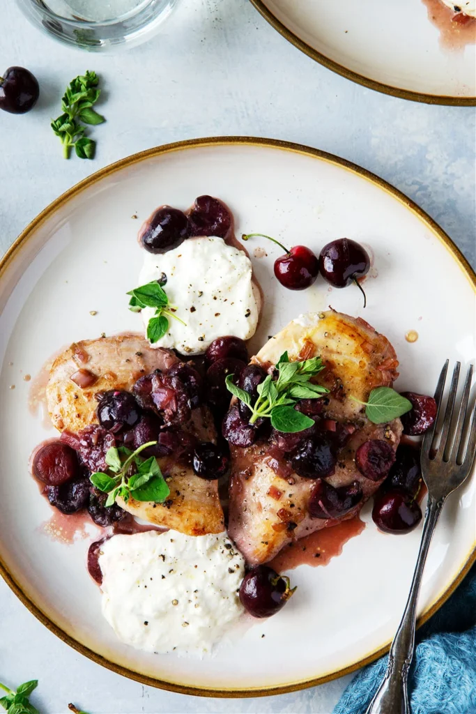 Pan roasted free range organic airline chicken topped with balsamic cherry reduction served with roasted beets & cauliflower puree, and seasonal vegetables