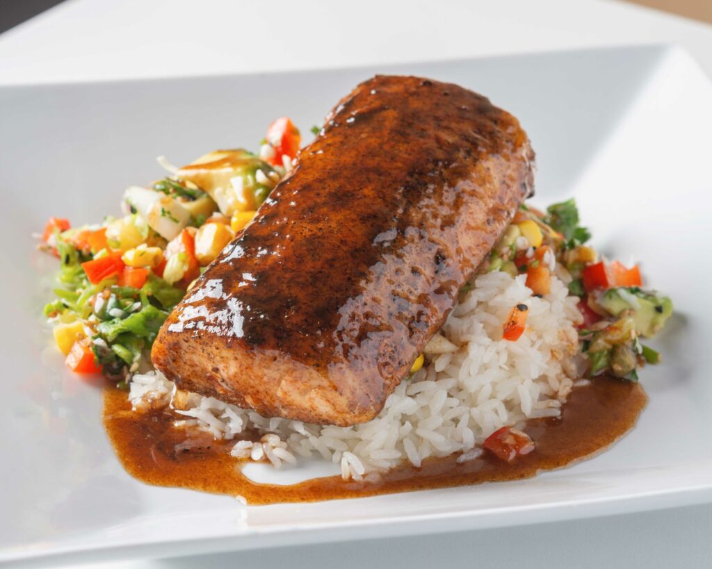 Teriyaki glazed Mahi-Mahi served over chili garlic vegetable fried rice