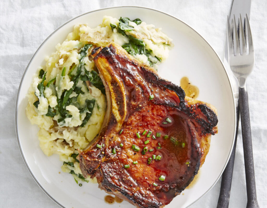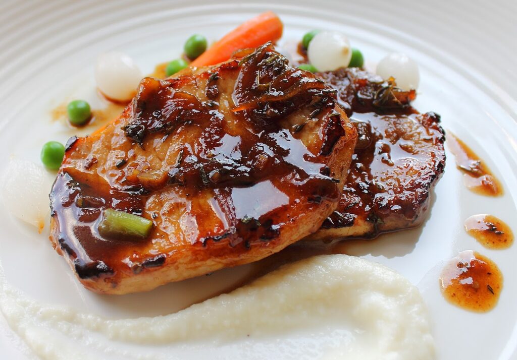 Grilled Duroc Pork chops topped with fig balsamic jam glaze, Yukon potato puree, and seasonal vegetables