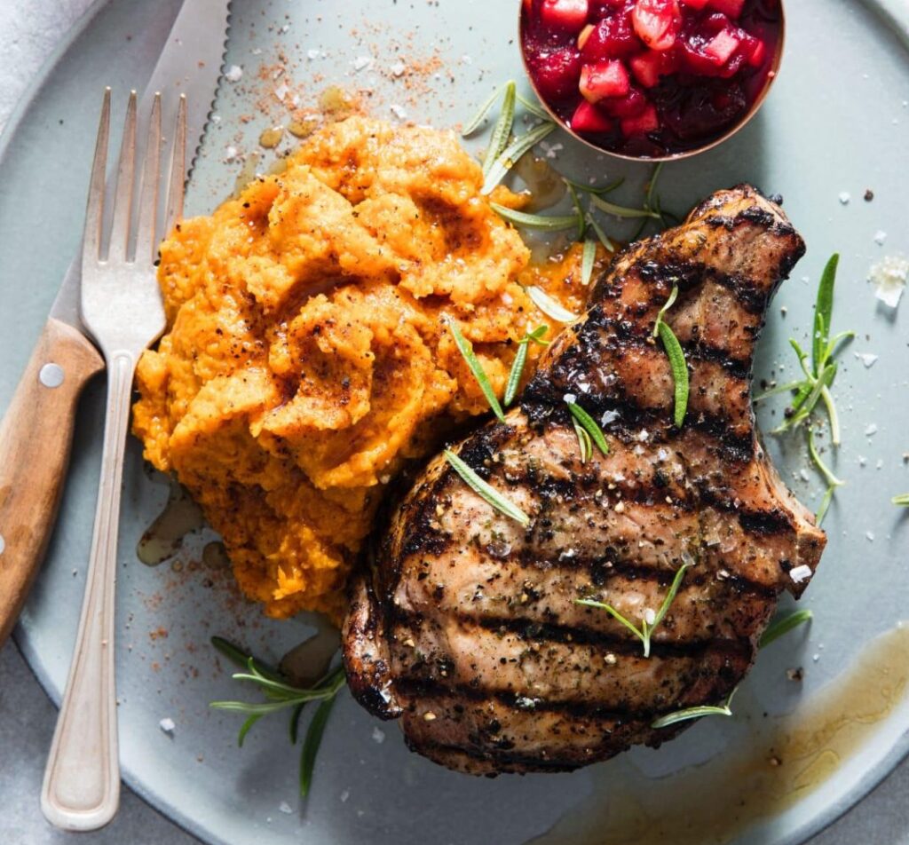 Char grilled bone in Patuxent farms pork chop served with porcini mushroom and shallots compound butter, roasted sweet potatoes, and seasonal vegetables