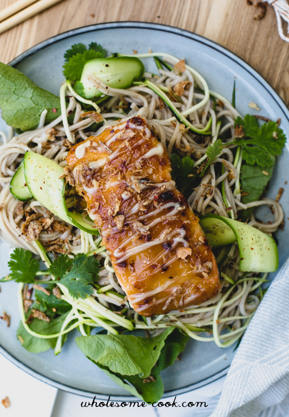 Miso-Glazed Mahi Mahi served with Japanese Soba noodles, Sesame-soy glaze, grilled baby bok choy