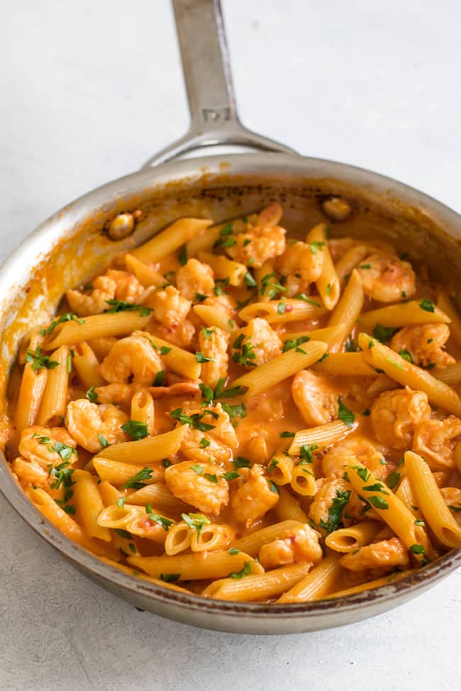 Shrimp penne alla vodka served with tuscan kale, blistered tomatoes, and parmesan reggiano