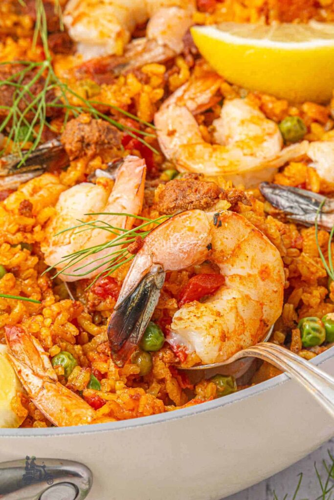 Shrimp paella topped with roasted red peppers& tomato sauce over saffron rice with smoky chorizo, peas, onions, and peppers