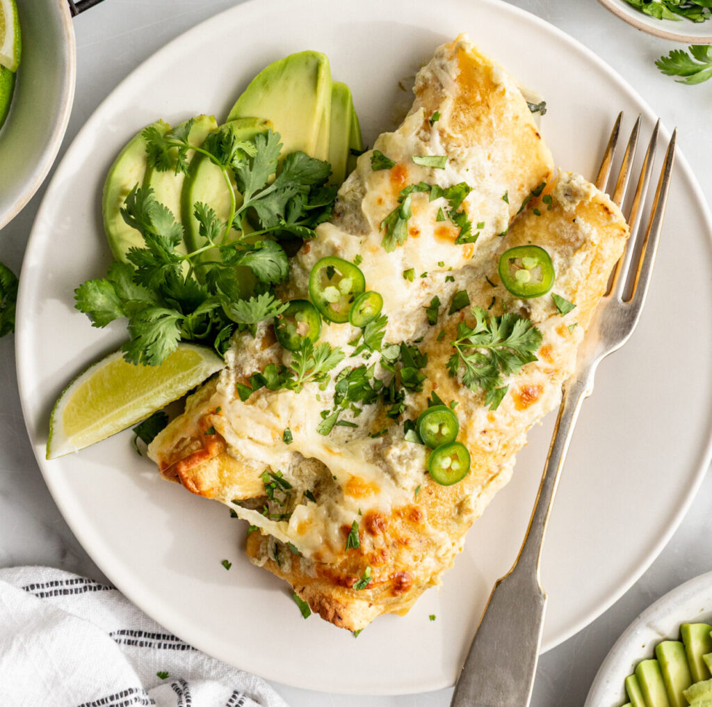 Chile verde chicken enchiladas served with Spanish rice, pinto beans, and Mexican street corn