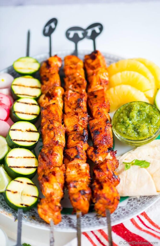 Peruvian grilled chicken served with aji verde (creamy green sauce) over chimichurri grilled seasonal vegetables