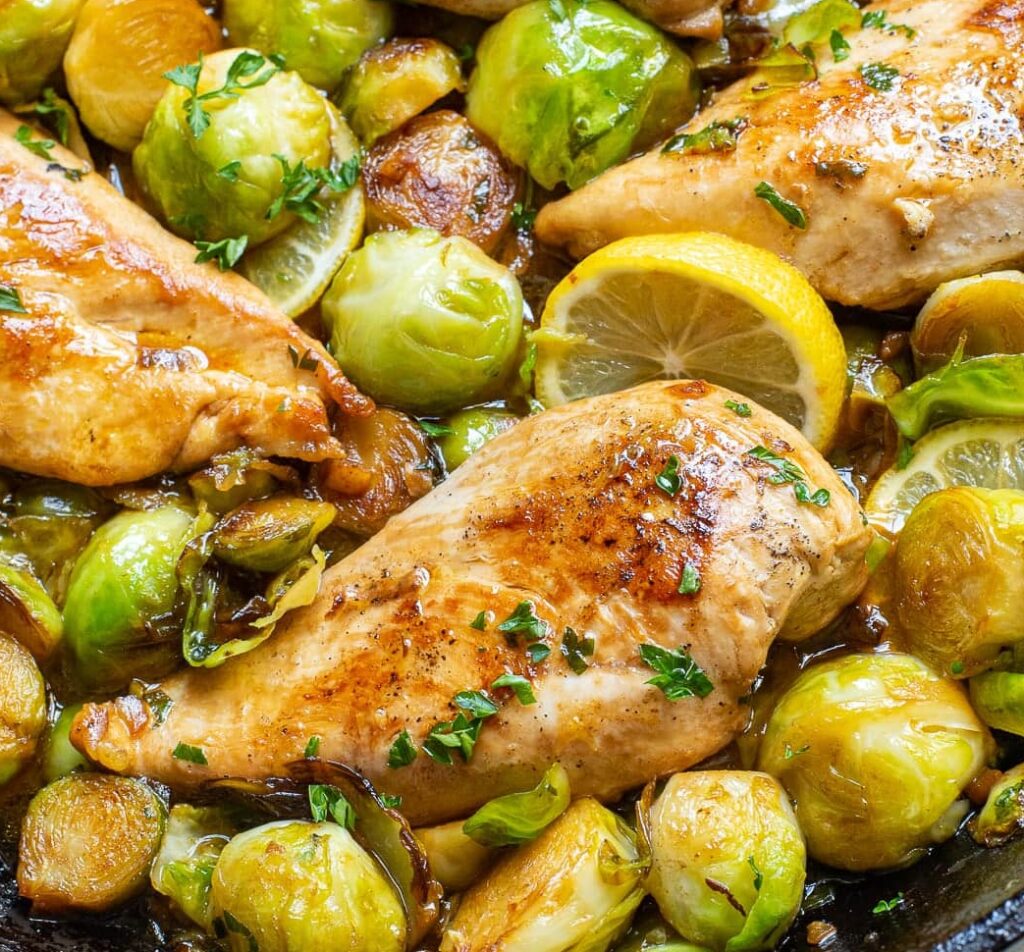 Citrus and fennel roasted free range chicken served with duck fat parmesan roasted Brussels sprouts