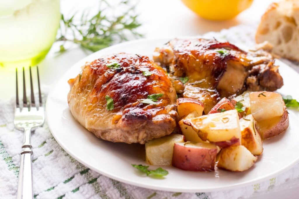 Pan roasted free range airline chicken topped with balsamic cherry reduction served with rosemary roasted potato medley, and seasonal vegetables