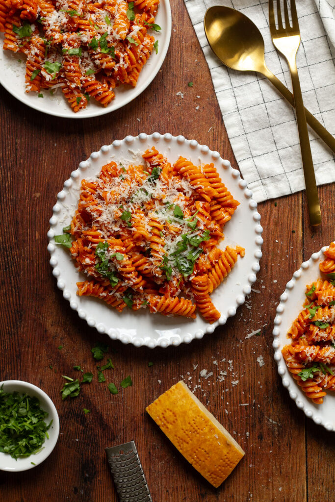 Creamy butternut squash fusilli alla vodka pasta served with spicy Italian turkey sausage, Tuscan kale, pecorino romano, and Italian basil