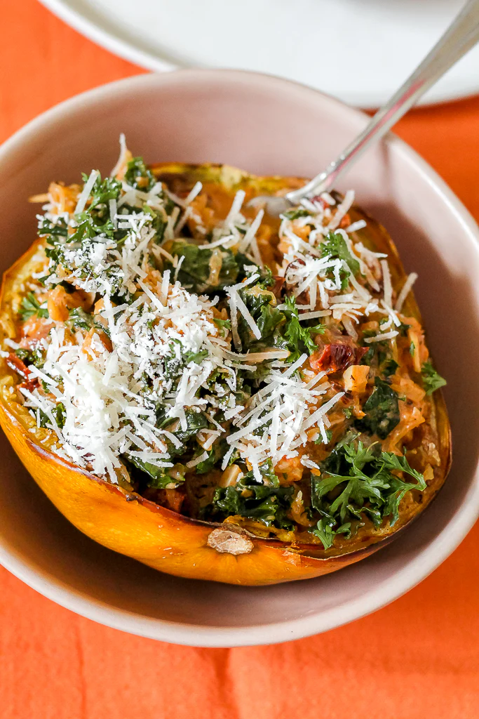 Shrimp squash alla vodka served with tuscan kale, blistered tomatoes, and parmesan reggiano