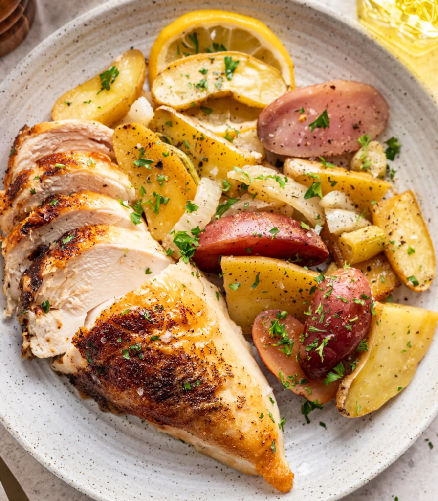 Citrus and fennel roasted free range chicken served with duck fat rosemary fingerling potatoes, and seasonal vegetables