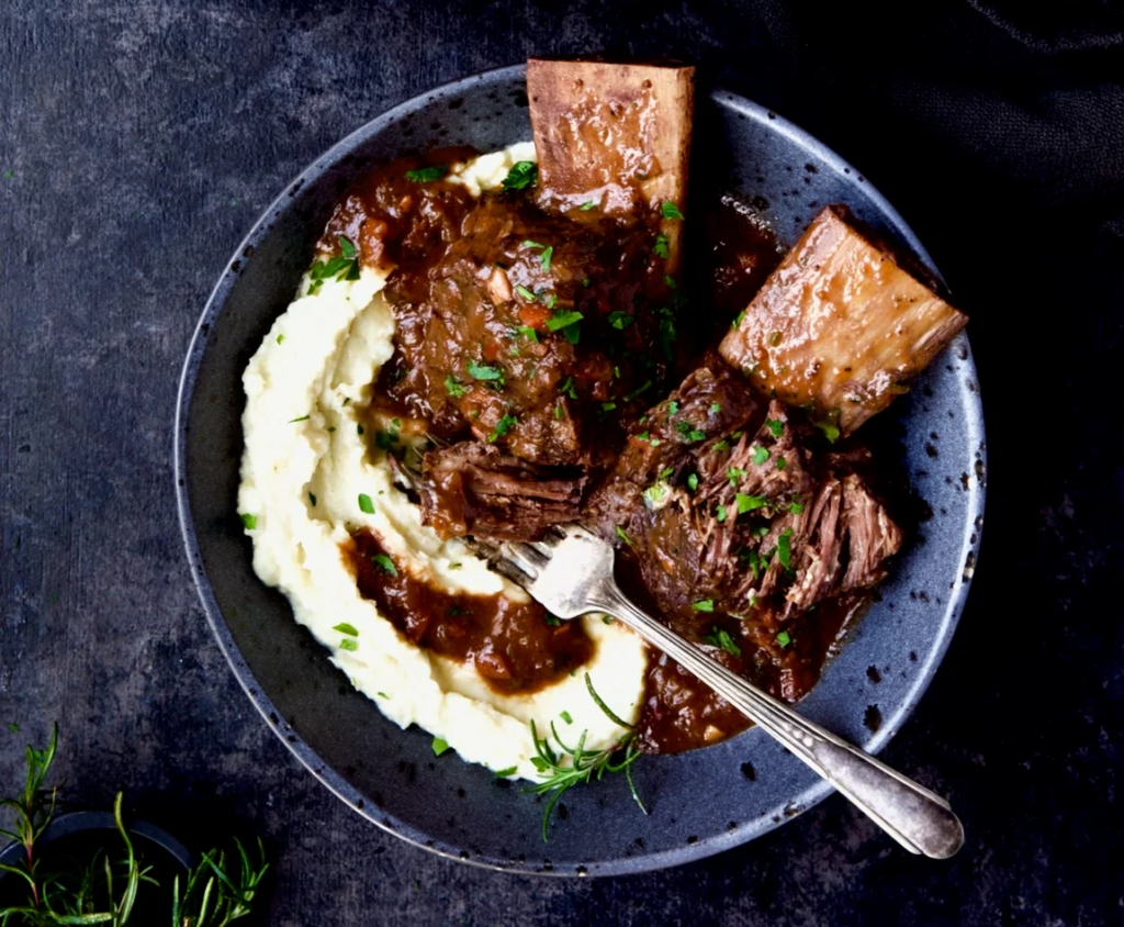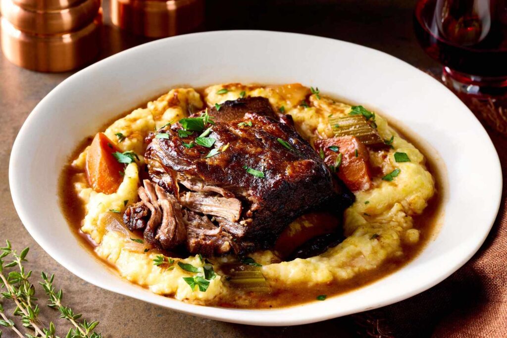 Red wine braised short ribs served over truffle Yukon potato purée, veal demi glacé, and seasonal vegetables