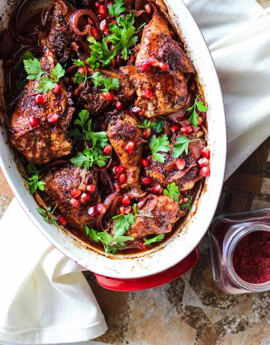 Sumac crusted free range chicken served over pomegranate and almond couscous, pan fried beech mushrooms, spinach, and blackberry vinaigrette