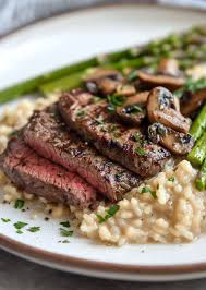 Pan roasted New York strip steak topped with veal Demi glacé served over shiitake mushroom risotto