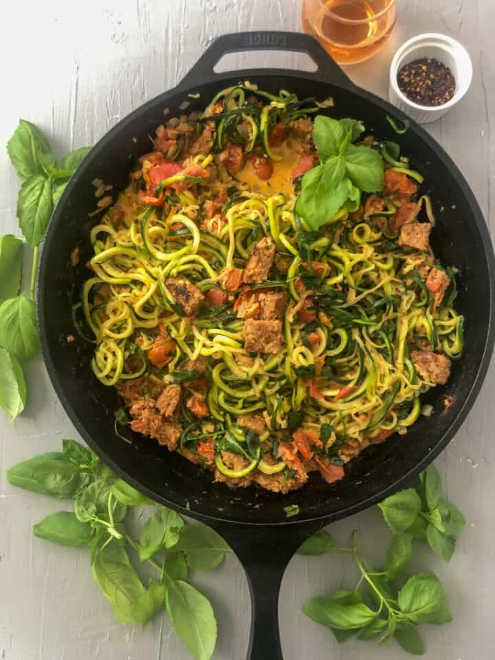 Creamy squash alla vodka zoodle pasta served with spicy Italian turkey sausage, Tuscan kale, pecorino romano, and Italian basil