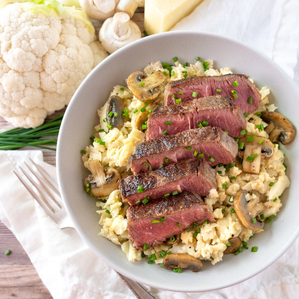 Pan roasted New York strip steak topped with veal Demi glacé served over shiitake mushroom cauliflower risotto