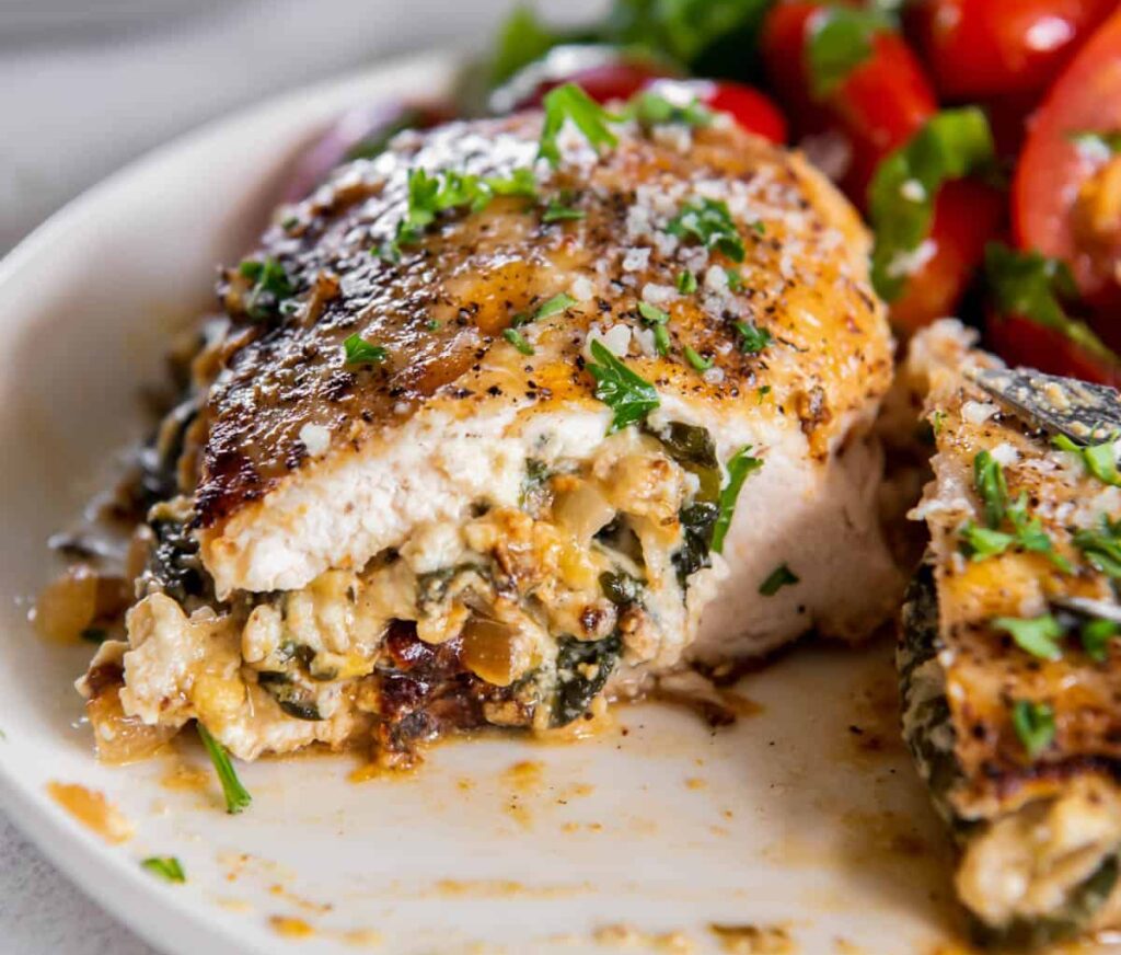 Green goddess chicken stuffed with herbed ricotta, spinach, and lemon zest, served with herbed farro and roasted root vegetables
