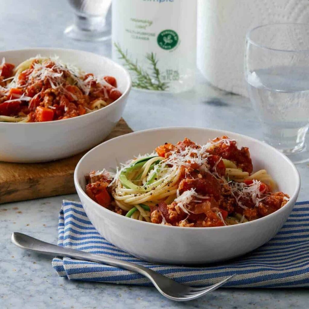 Turkey bolognese served in a rich red wine tomato sauce over zucchini zoodles topped with pecorino romano and Italian basil (vegan parmesan substitute for dairy free requests)