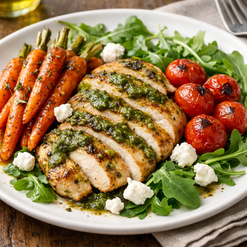Organic Chicken pesto served with honey roasted baby carrots, goat cheese, blistered tomatoes, and organic baby arugula