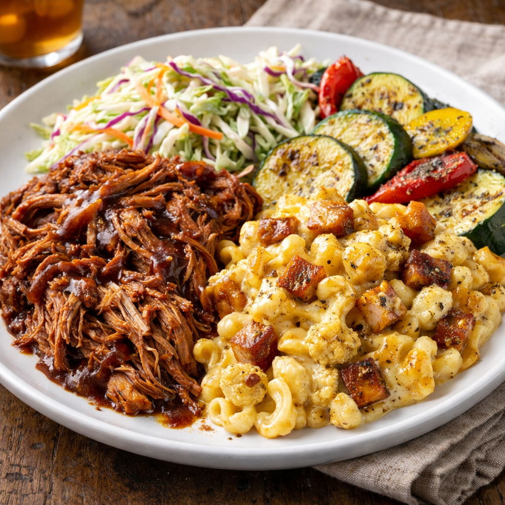 Carolina style pulled pork served with pork belly cauliflower Mac and cheese, coleslaw, and grilled vegetables