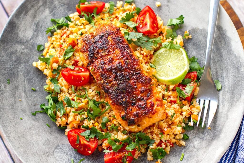 Blackened Wild Caught Salmon topped with creole compound butter over Cajun dirty cauliflower rice