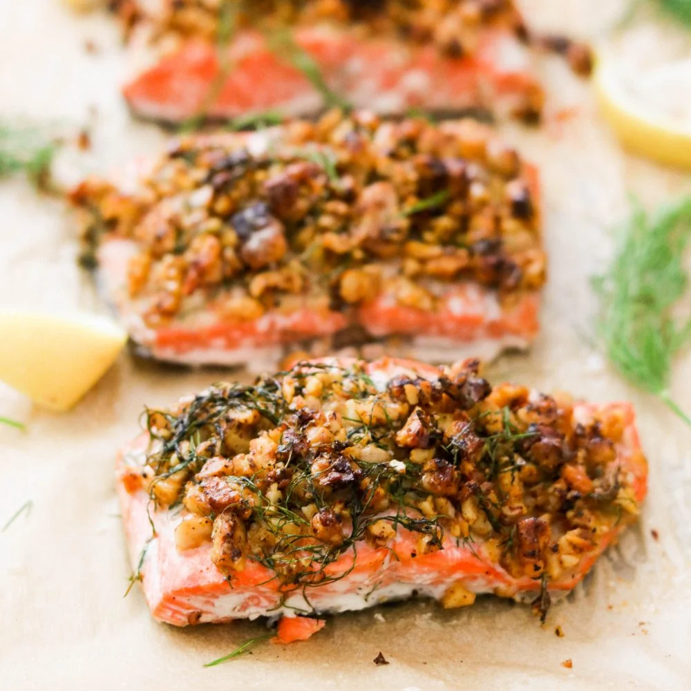 Walnut rosemary crusted baked Wild Caught Salmon served over duck fat roasted potatoes, and seasonal vegetables
