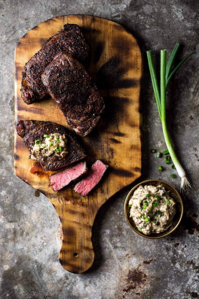 Coffee and chili crusted grass-fed Tri-Tip steak served with chorizo cauliflower mash, and seasonal vegetables